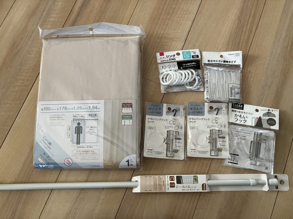 すべて100均で揃います。今回はカーテンを使いましたが、のれんや薄手の布などでも代用できます。設置場所や好みに合わせて、自由にアレンジできるのも魅力です。